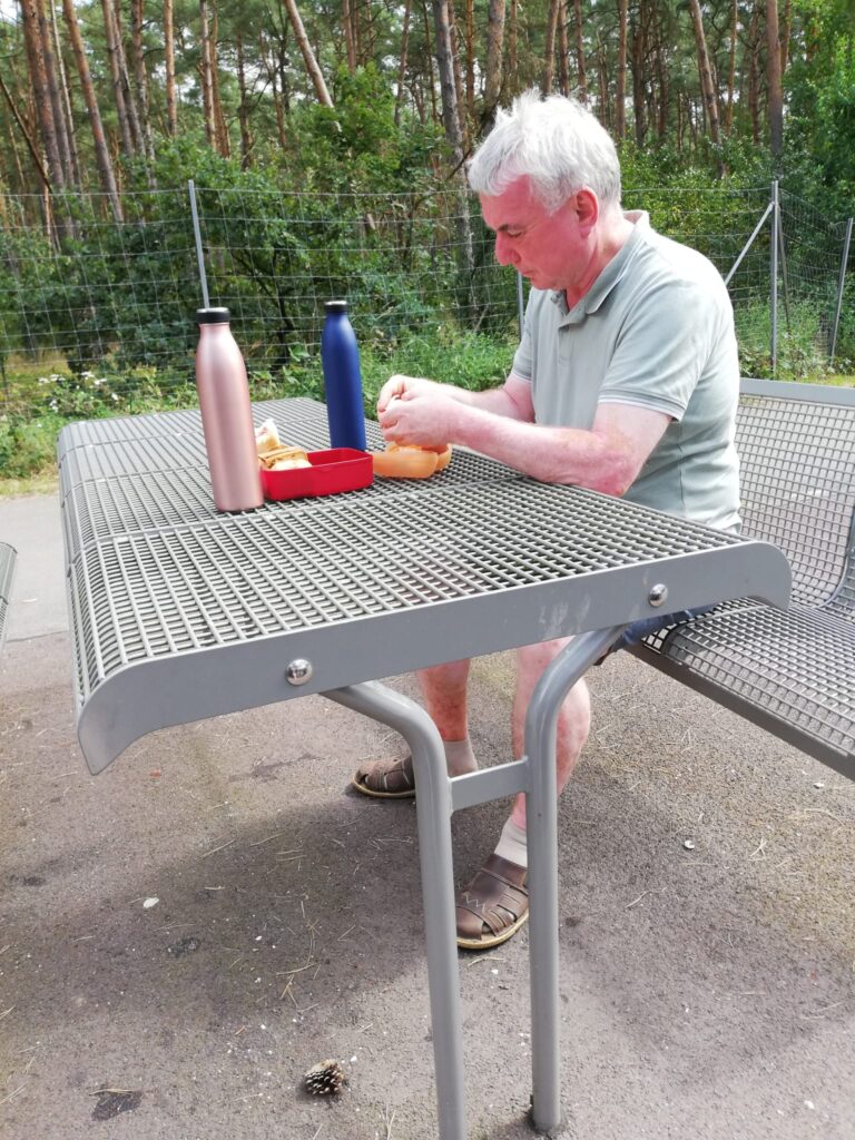 Hier noch eine Momentaufnahme von unterwegs. Es gab ein Wurstbrötchen und ein gekochtes Ei.