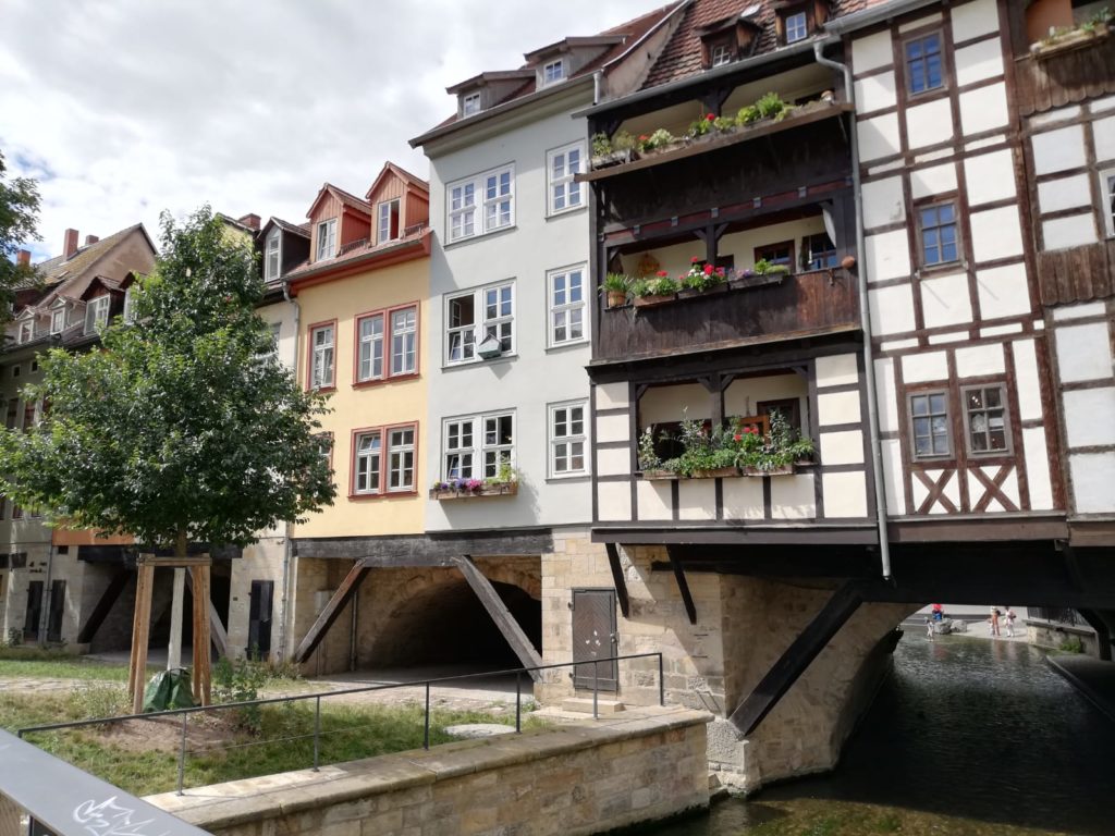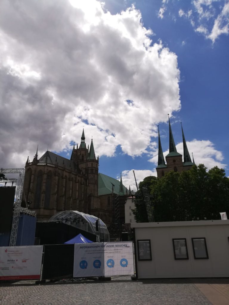 Weiter ging es in die Altstadt und zuerst zum Dom. Da hier für eine Veranstaltungsreihe eine Bühne aufgebaut wird, konnte man leider keine schönen Bilder vom Dom machen. Bei einem Eisbecher, der wirklich lecker war, genossen wir den imposanten Anblick. Unser nächstes Ziel sollte dann noch die Krämerbrücke sein. Hier kauften wir besonderen Senf, reagional produziert, und ein Geschenk für die frisch verheirateten Nachbarn.