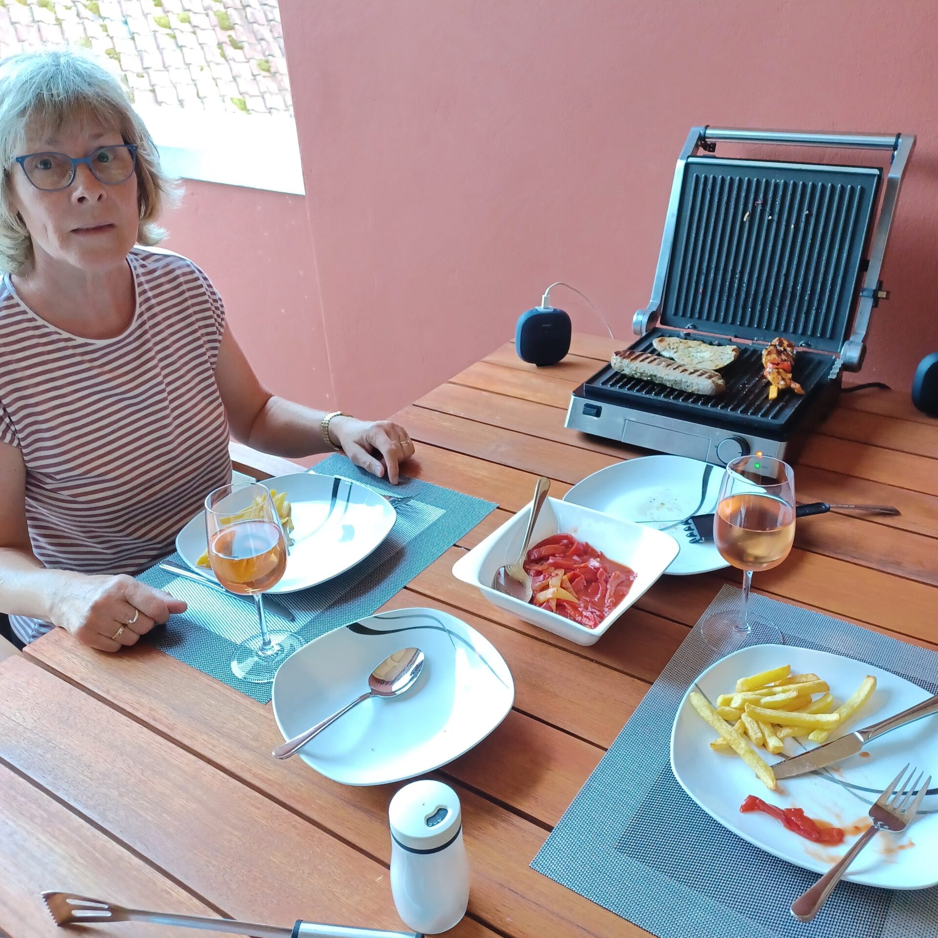 Zum Abendessen wurde gegrillt. Lammlachs für die Dame, Schweinesteak und Hähnchenspieß für den Herren.