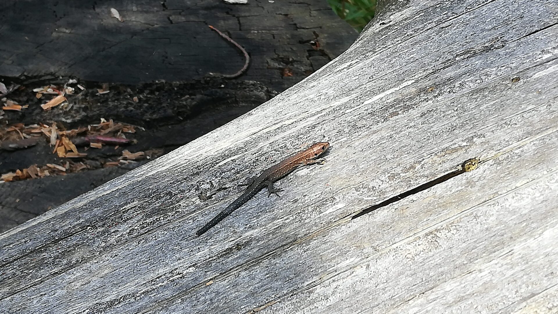 Uns begegnete in der Nähe der oberen Wasserfälle tatsächlich auch eine kleine Waldeidechse, die sich auf einem Baumstamm sonnte.