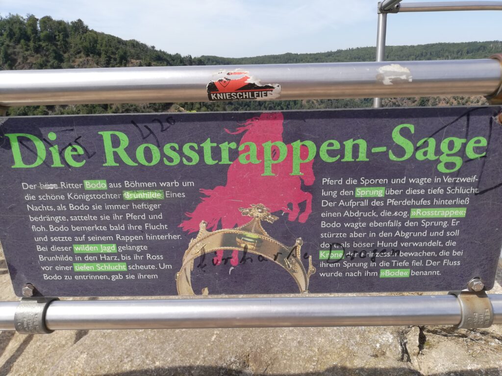 Auf dem Weg zum Punkt des Geschehens, dem Abdruck des riesigen Hufes von Bodos Rappen, versuchten so manche Eltern und Großeltern den lieben Kleinen die Sage von der Roßtrappe zu erzählen. Irgendwie kamen aber alle nicht wirklich zum Ziel. Zum Glück hat man ein Schild mit der Kurzfassung der Sage angebracht.