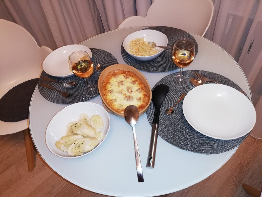 Mit Hackbällchen Toskana, Salat und Créme Brülée verwöhnten wir uns zum Abendessen.