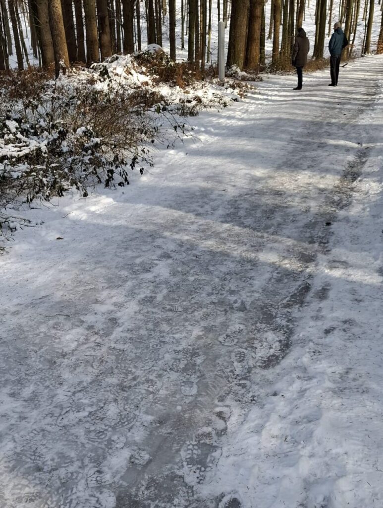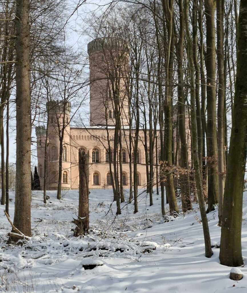 Eine direkte Zufahrt mit Bus oder PKW zum Schloss ist nicht möglich. So mussten die 2 Kilometer zum Ziel zu Fuß bewältigt werden. Klar doch, im verschneiten Winterwald zu laufen, war schon beeindruckend und angenehm, wenn diese Eisflächen zwischendrin nicht wären.