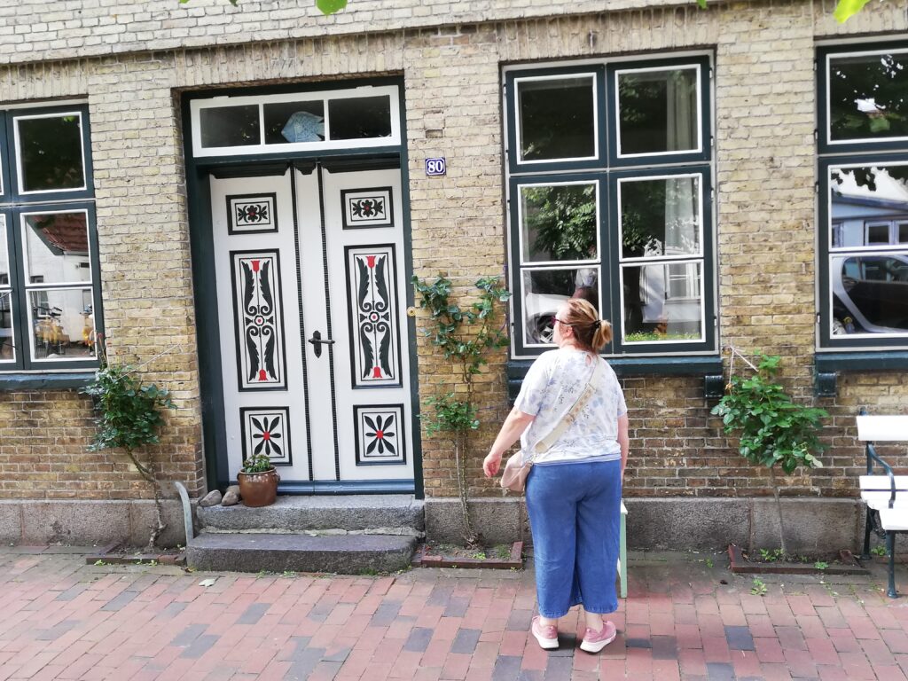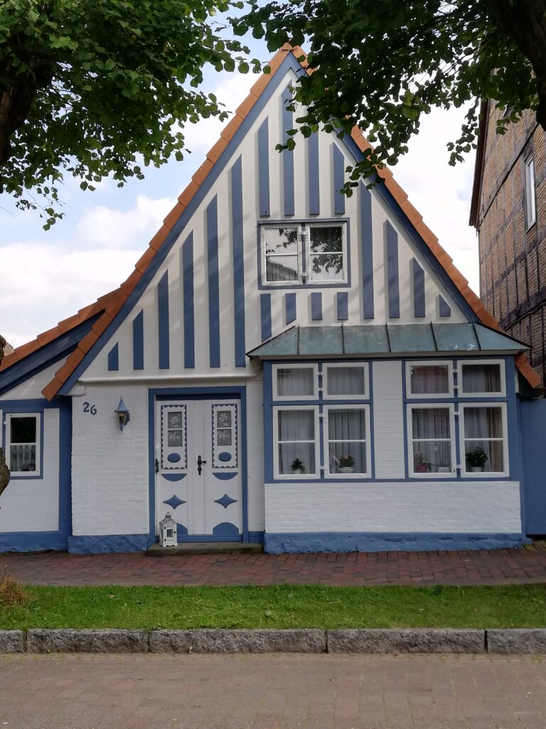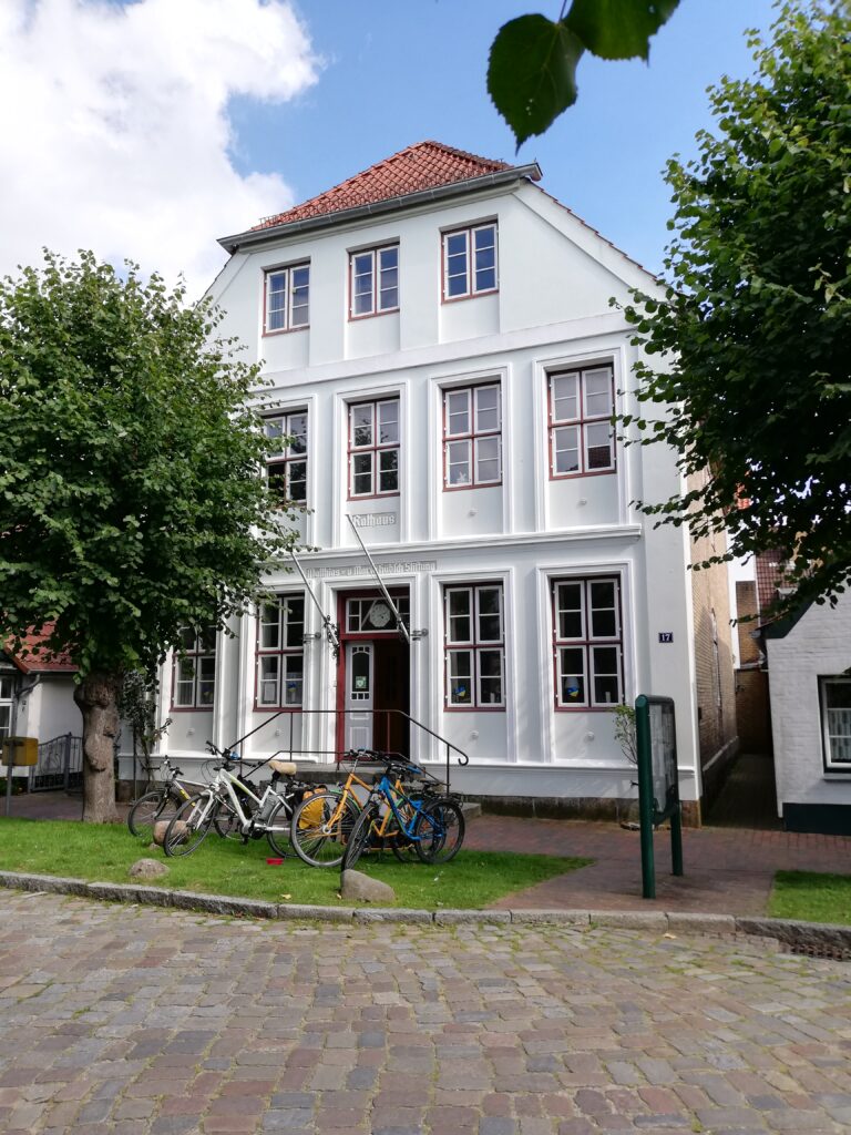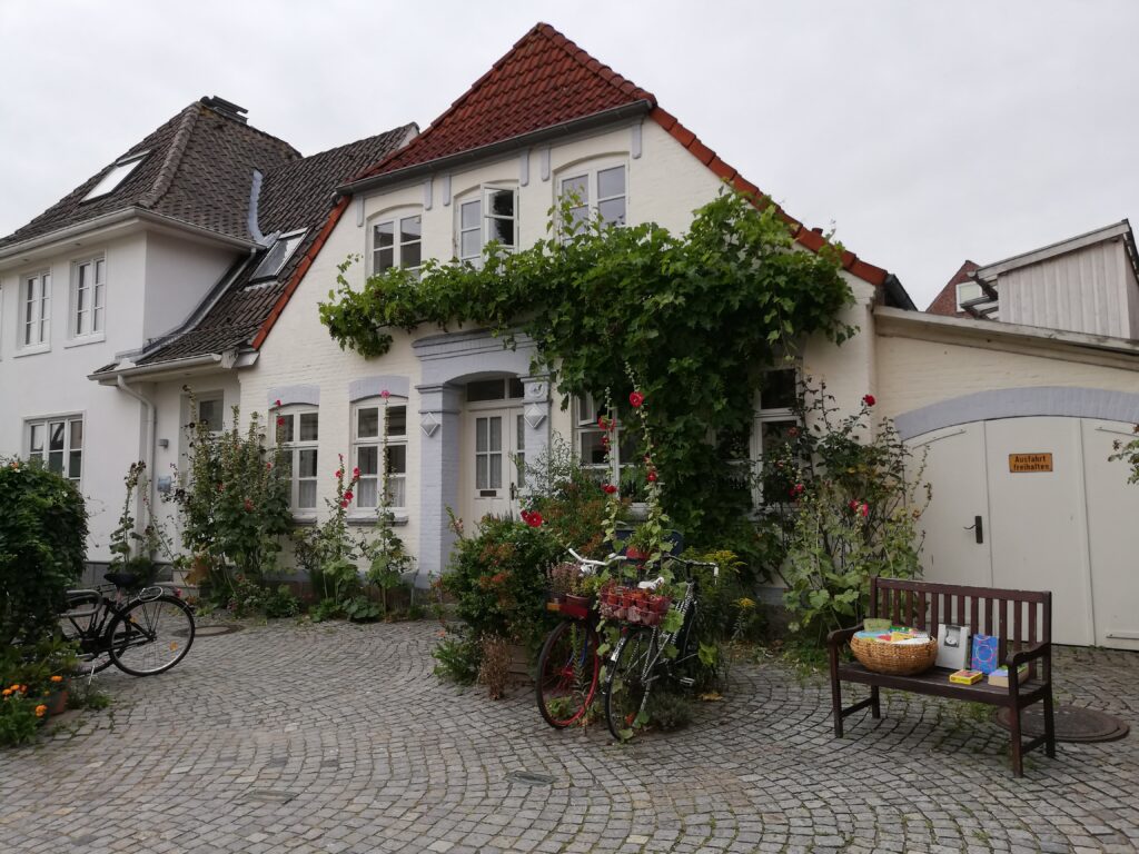 Tatsächlich fühlten wir uns in vergangene Zeiten versetzt, als wir durch die wenigen Straßen mit den niedrigen und liebevoll restaurierten Fachwerkhäusern schlenderten. Viele davon haben die typischen „Utluchten“, Fenstervorsprünge, in denen oftmals Schiffsmodelle standen. Vor den Häusern blühen fast überall Rosenstöcke. Linden säumen die Allee, die von einem zum anderen Ende der Stadt führt. Um die Stadt herum führt ein Rundweg vorbei an Werften, der Fähre (die natürlich auch nicht fährt), Anlegeplätzen und einer Badestelle.