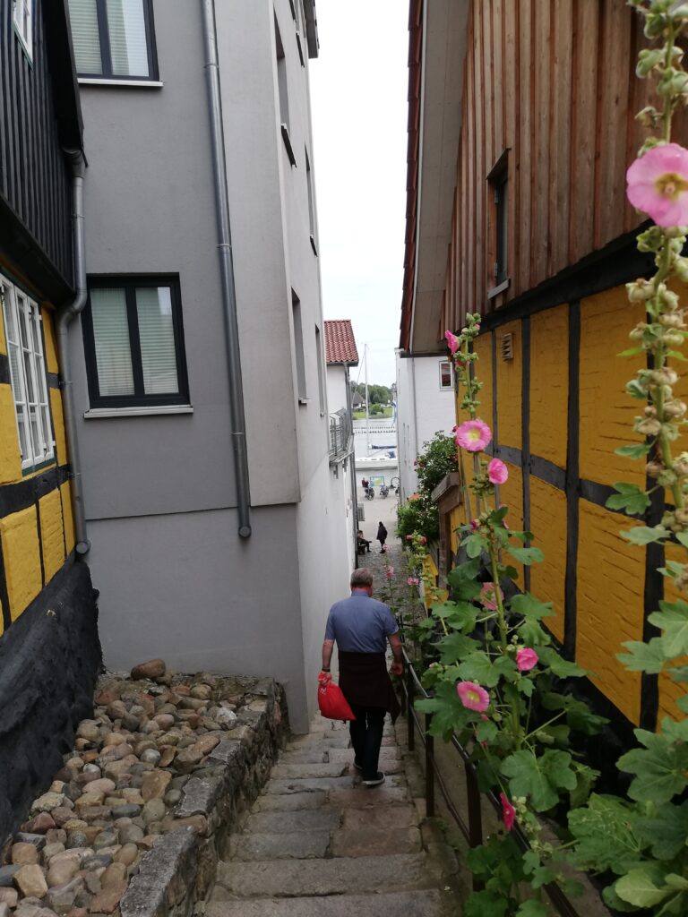 Hinter der Sankt Nikolai-Kirche öffnet sich nach wenigen Schritten einer der schönsten Plätze Kappelns. Er ist umsäumt von Rosen und Fachwerkhäusern. Eine alte Steinstiege führt hinunter zum Hafen.