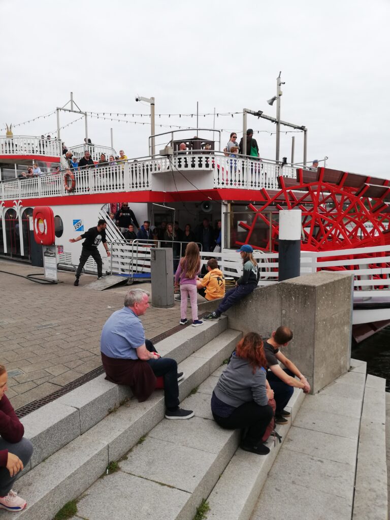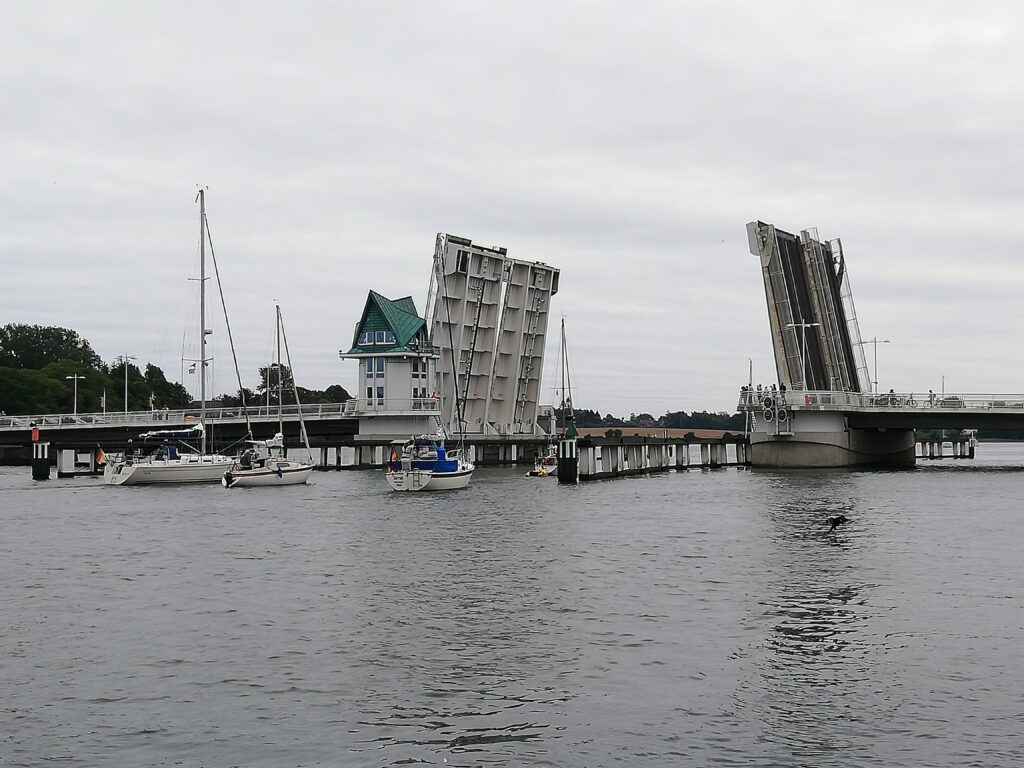 Vom Hafen aus beobachteten wir die Öffnung der Klappbrücke („immer um viertel vor“), durch die zahlreiche größere und kleinere Schiffe ihre Reise in beide Richtungen fortsetzten.