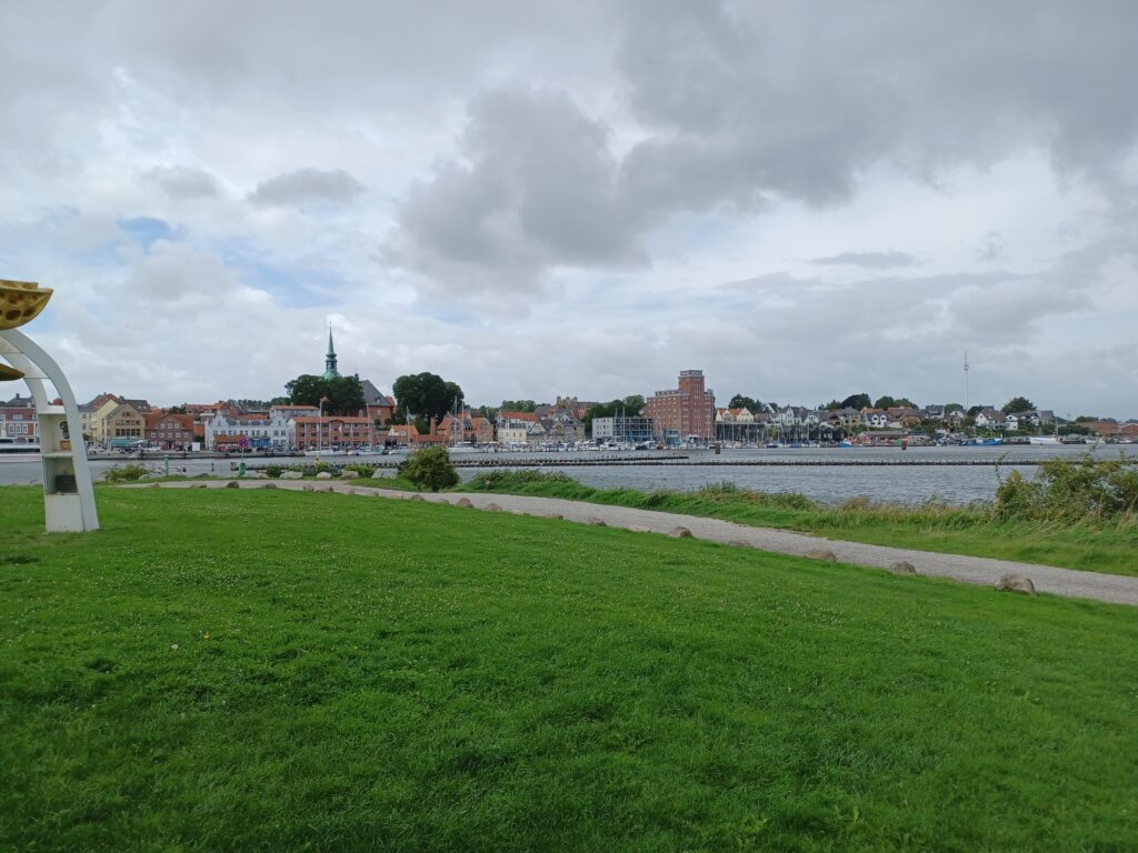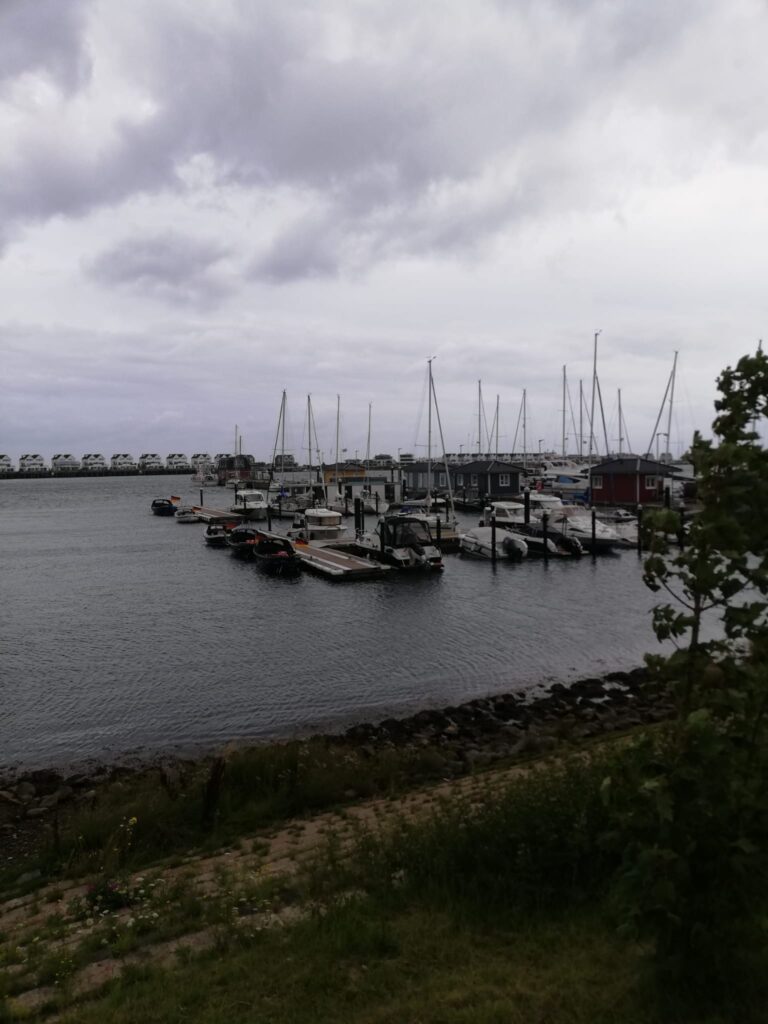 Dort liegt der Ort Olpenitz. Durch den Aufbau des Marinestützpunkts Olpenitz 1959 entstand hier Deutschlands größter Marinehafen an der Ostsee, der aber 2005 geschlossen wurde. Auf dem Areal sollte ein riesiges OstseeResort entstehen. Ist es auch. Tausende Ferienunterkünfte zu Land und zu Wasser mit maximalem Leerstand in der Hochsaison. Und es wird noch immer weiter gebaut. Obwohl diese Häuser modern sein sollen, wirkte auf uns alles sehr unpersönlich und wenig einladend. Auch der Strand entspricht in keinster Weise dem Komfort an unserer Küste. Aber wir müssen uns dort ja nicht einmieten.