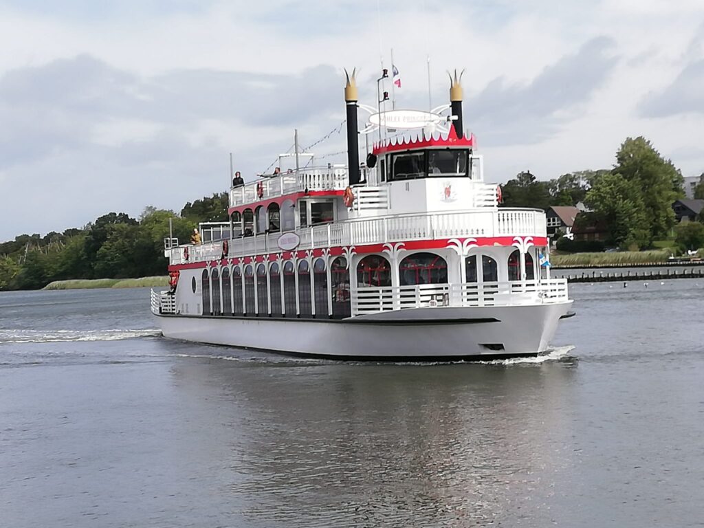 Nach einem leckeren Fischbrötchen machten wir auf dem Rückweg in Kappeln Station. Dort blieb die Brücke wegen des immer stärker werdenden Windes geschlossen. Es waren bis auf den Raddamfer keine Schiffe unterwegs. Aber viele Touristen. Wir schlossen uns ihnen an.
