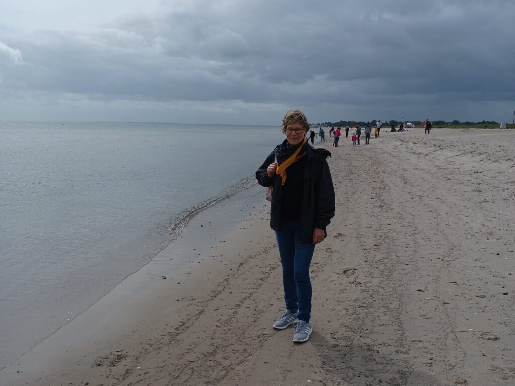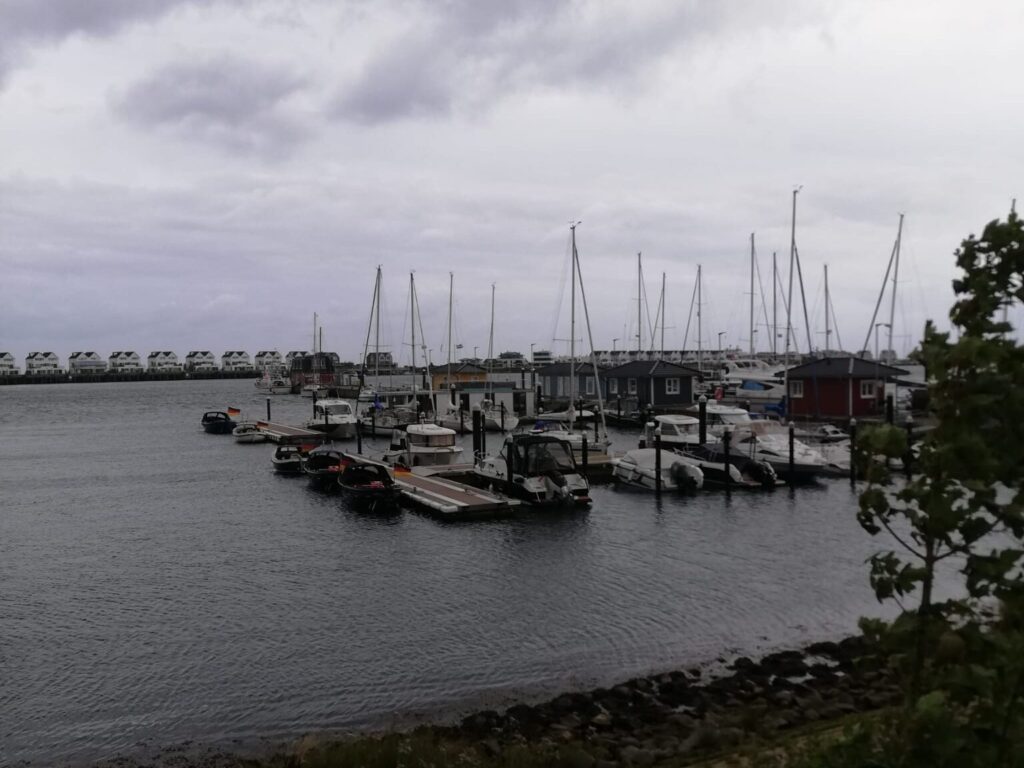 Dort liegt der Ort Olpenitz. Durch den Aufbau des Marinestützpunkts Olpenitz 1959 entstand hier Deutschlands größter Marinehafen an der Ostsee, der aber 2005 geschlossen wurde. Auf dem Areal sollte ein riesiges OstseeResort entstehen. Ist es auch. Tausende Ferienunterkünfte zu Land und zu Wasser mit maximalem Leerstand in der Hochsaison. Und es wird noch immer weiter gebaut. Obwohl diese Häuser modern sein sollen, wirkte auf uns alles sehr unpersönlich und wenig einladend. Auch der Strand entspricht in keinster Weise dem Komfort an unserer Küste. Aber wir müssen uns dort ja nicht einmieten.