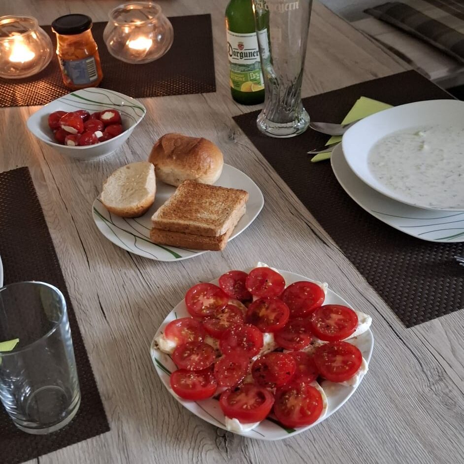 Zum Essen gab es heute noch einmal Tarator, Backkäse und als Dessert Johannisbeeren.