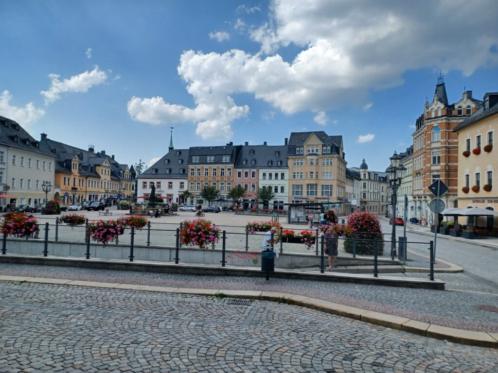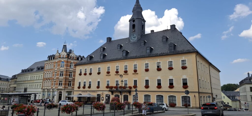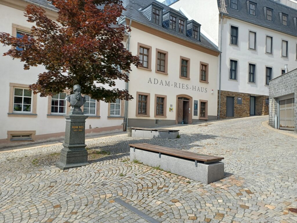 Also ging es gleich weiter nach Annaberg-Buchholz. Die Stadt ist nicht nur eine Große Kreisstadt im sächsischen Erzgebirgskreis, sondern zugleich auch die bevölkerungsreichste Stadt im Landkreis. Zahlreiche Museen sind hier zu finden. Die Manufaktur der Träume, bestimmt für Kinderaugen sehr interessant. Wir näherten uns dem Adam-Ries-Haus, in dem sich auch das Adam-Ries-Museum befindet. Wer kennt ihn nicht, den Rechenmeister, der von den Mathelehrern gern erwähnt wird. Schließlich haben wir ihm die heutigen Rechenverfahren zu verdanken.
