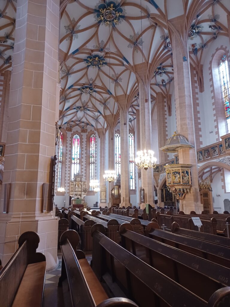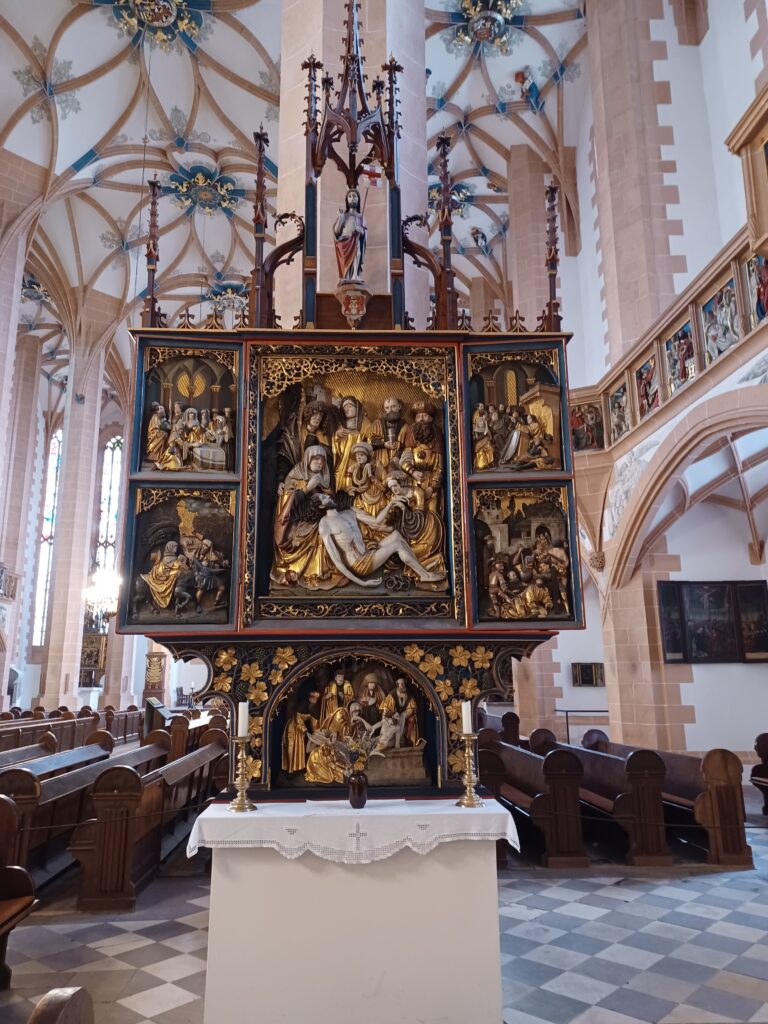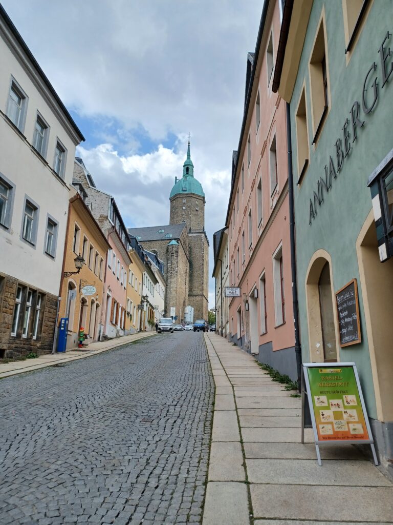 Unser Rundgang durch Annaberg-Buchholz endete mit dem Besuch der Sankt Annenkirche. In der dreischiffigen Hallenkirche befindet sich der (zumindest der älteren Generation von uns) aus dem Kunstunterricht bekannte Annaberger Bergaltar. Er zeigt eindrucksvoll eine erzgebirgische Bergbaulandschaft und bergmännisches Leben vor 500 Jahren.
