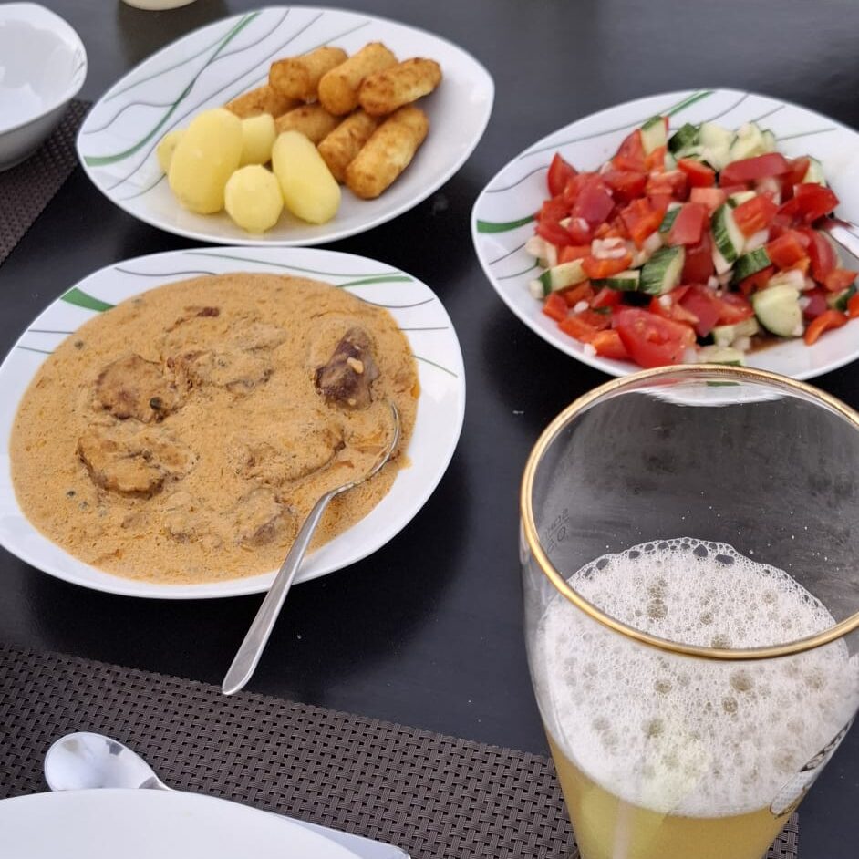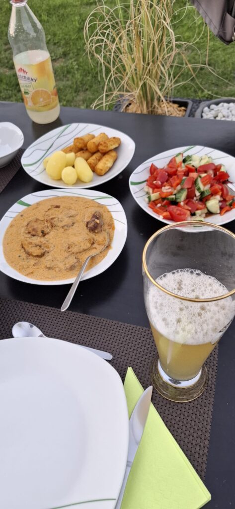 Ein leckeres Abendessen, bestehend aus Medaillons in Pfeffer-Rahm-Sauce, Kroketten und einem Salat, rundete den Tag ab. Als Nachtisch gab es Johannisbeeren.