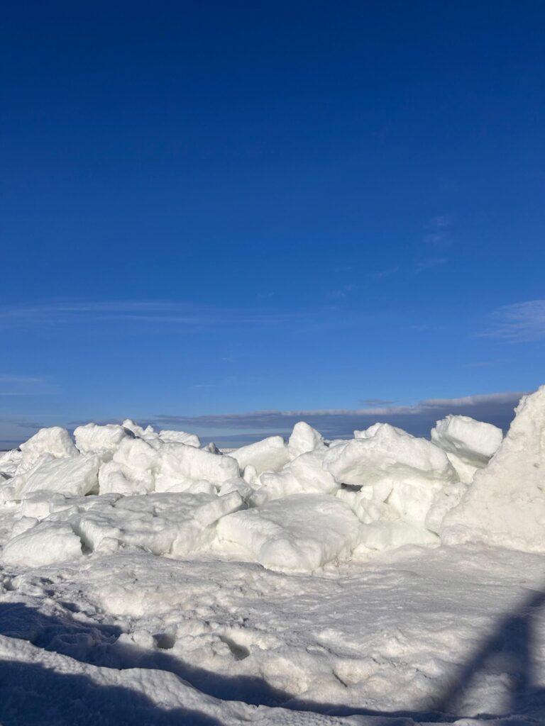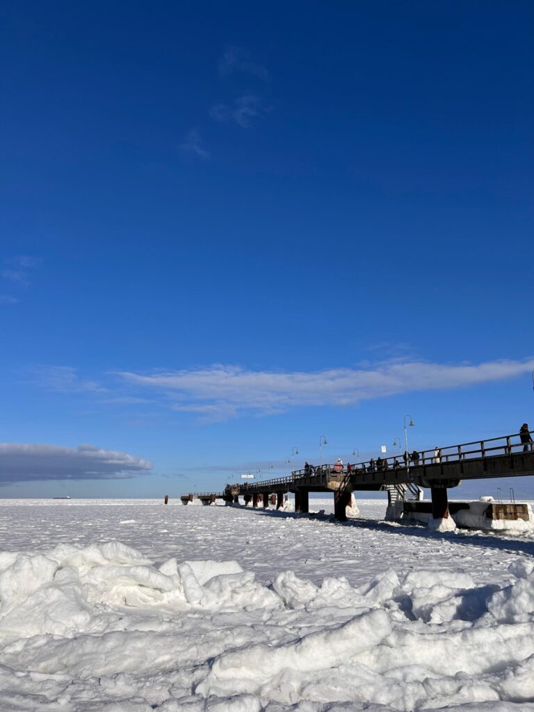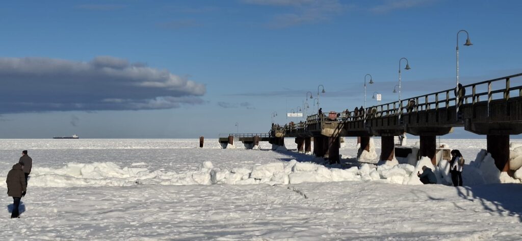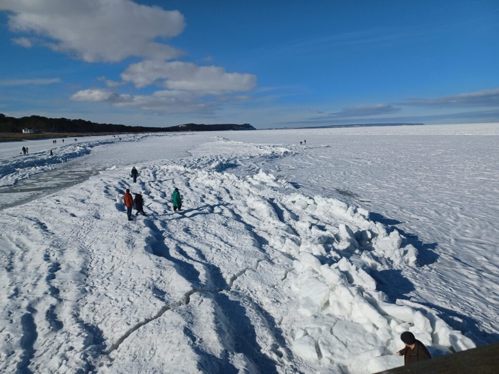 Beim ausgiebigen Frühstück war schnell der Entschluss gefasst, den Tag in und um Göhren zu verbringen. Diese Idee hatten ganz offensichtlich viele Ostseebesucher. Strand und Seebrücke waren reichlich gefüllt. Ganz Mutige wagten sich wieder auf die zugefrorene Ostsee. Aufgetürmte Eisschollen, aber auch Risse im Eis mussten erkundet und in zahlreichen Fotos festgehalten werden.