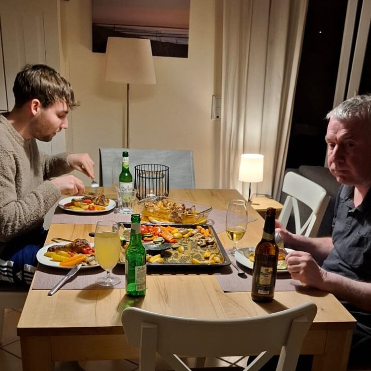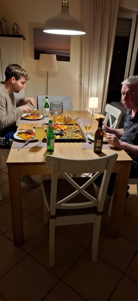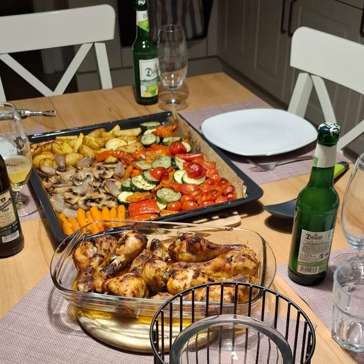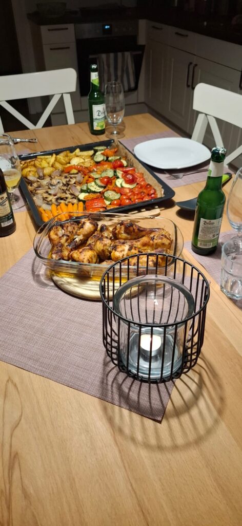 Zum Abend gab es Ofen-Hähnchen mit mediterranem Gemüse und eine Mousse au Chocolat.
