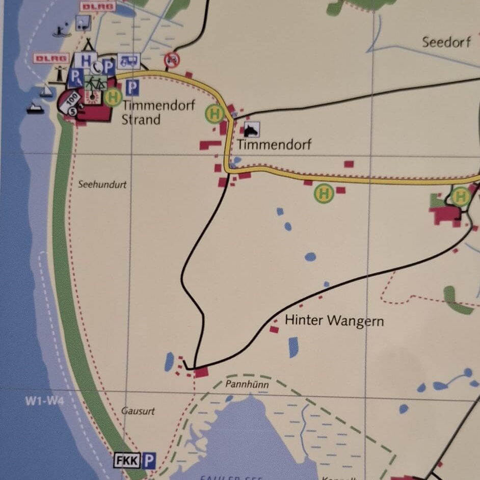 Anders, als ursprünglich geplant, fuhren wir bis zum Parkplatz Grotes Kammrad am Faulen See. Von dort aus ging es landseitig (weil windgeschützt) nach Timmendorf, wo wir erstmal den, einem Teil der Familie bekannten, Reiterhof inspizierten. Matti, Mäxchen und ich waren vor vielen Jahren dort einmal zum Essen eingekehrt und konnten dabei in der Reithalle die jungen Reiter beobachten.