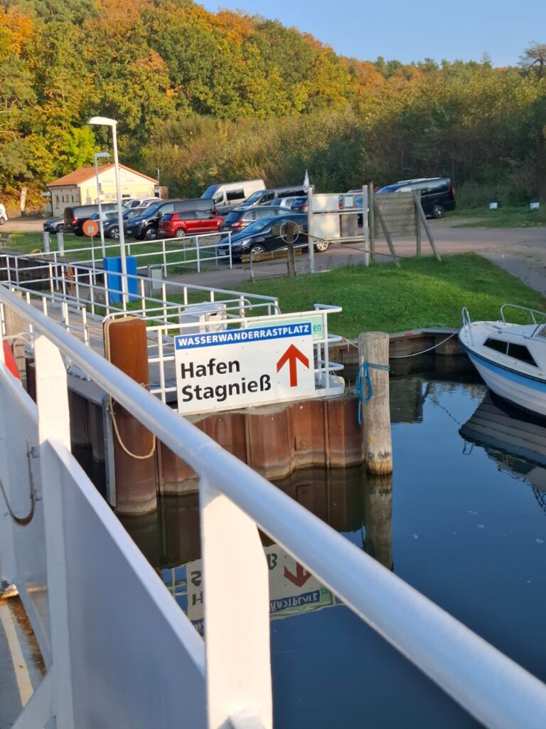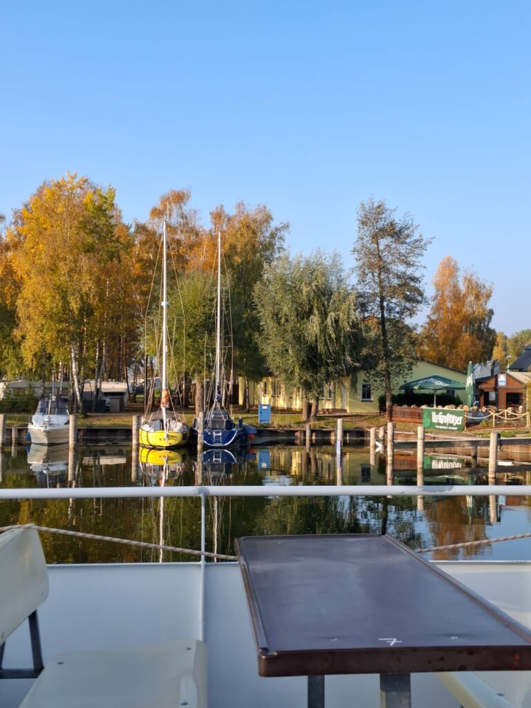 Uns erwartete ein traumhafter kleiner Naturhafen. Er liegt ganz versteckt am Achterwasser. Es ist alles da. Eine Hafenmeisterei, ein Café, ein Imbiss, sogar ein Campingplatz. Alles erschien in Miniatur, auch das Wasser plätscherte leise an der Kaikante.