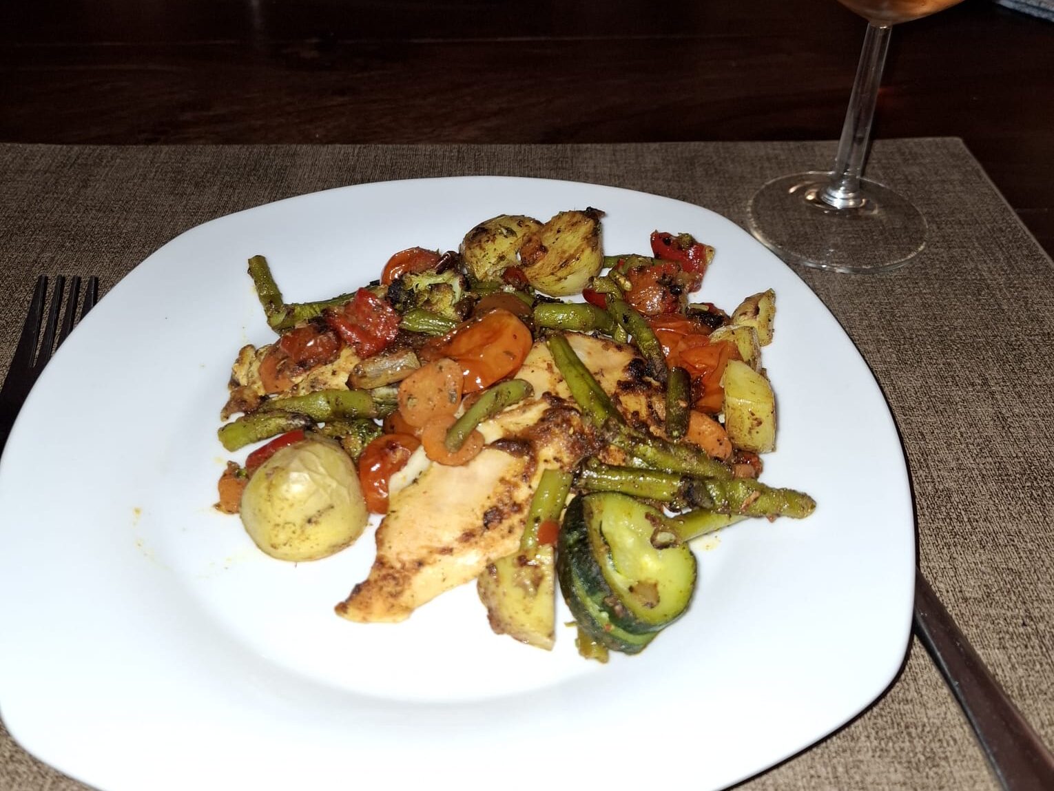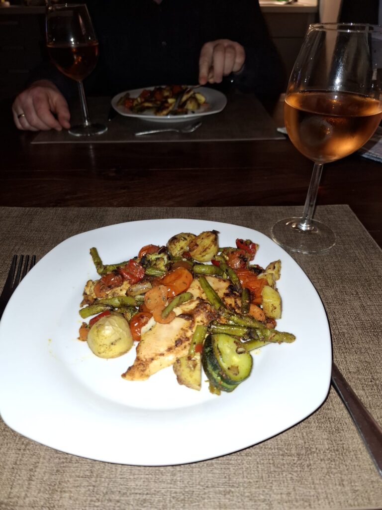 Am letzten Abend unseres Urlaubs genießen wir Ofenhähnchen mit Gemüse und Kartoffeln. Auf dem Blech zubereitet, daher eine Menge und wieder sehr lecker. Dazu gibt es ausnahmsweise einen Roséwein.