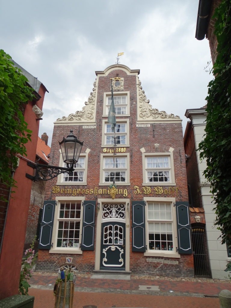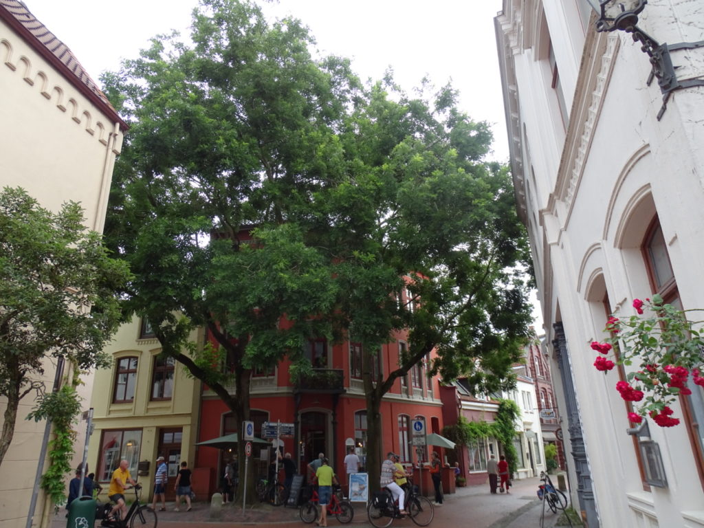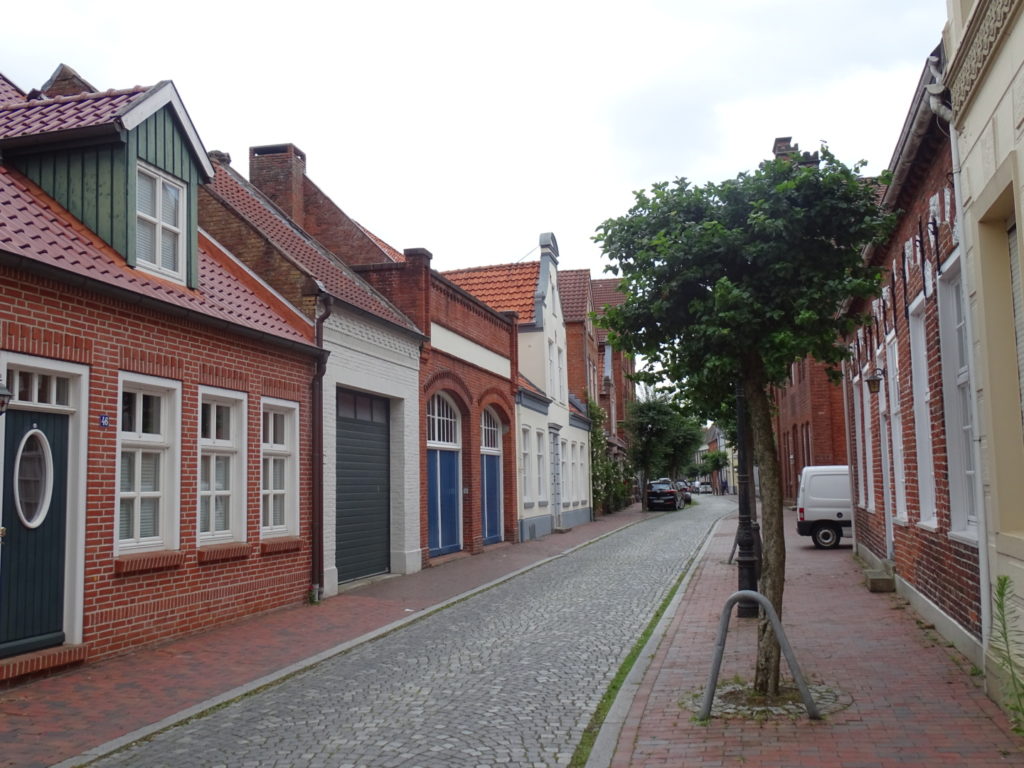 Aber Leer hat noch mehr zu bieten. Neben einer wunderschönen Altstadt eine lange Promenade entlang der Leda, die durch die Stadt fließt, während die Ems etwas außerhalb vorbeiströmt. Vom kleinen Stadthafen, von dem auch Rundfahrten mit Fahrgastschiffen angeboten werden, liegt nur einen Katzensprung das Antik-Cafe der Stadt entfernt, in dem wir uns ein großes Stück Torte genehmigten.