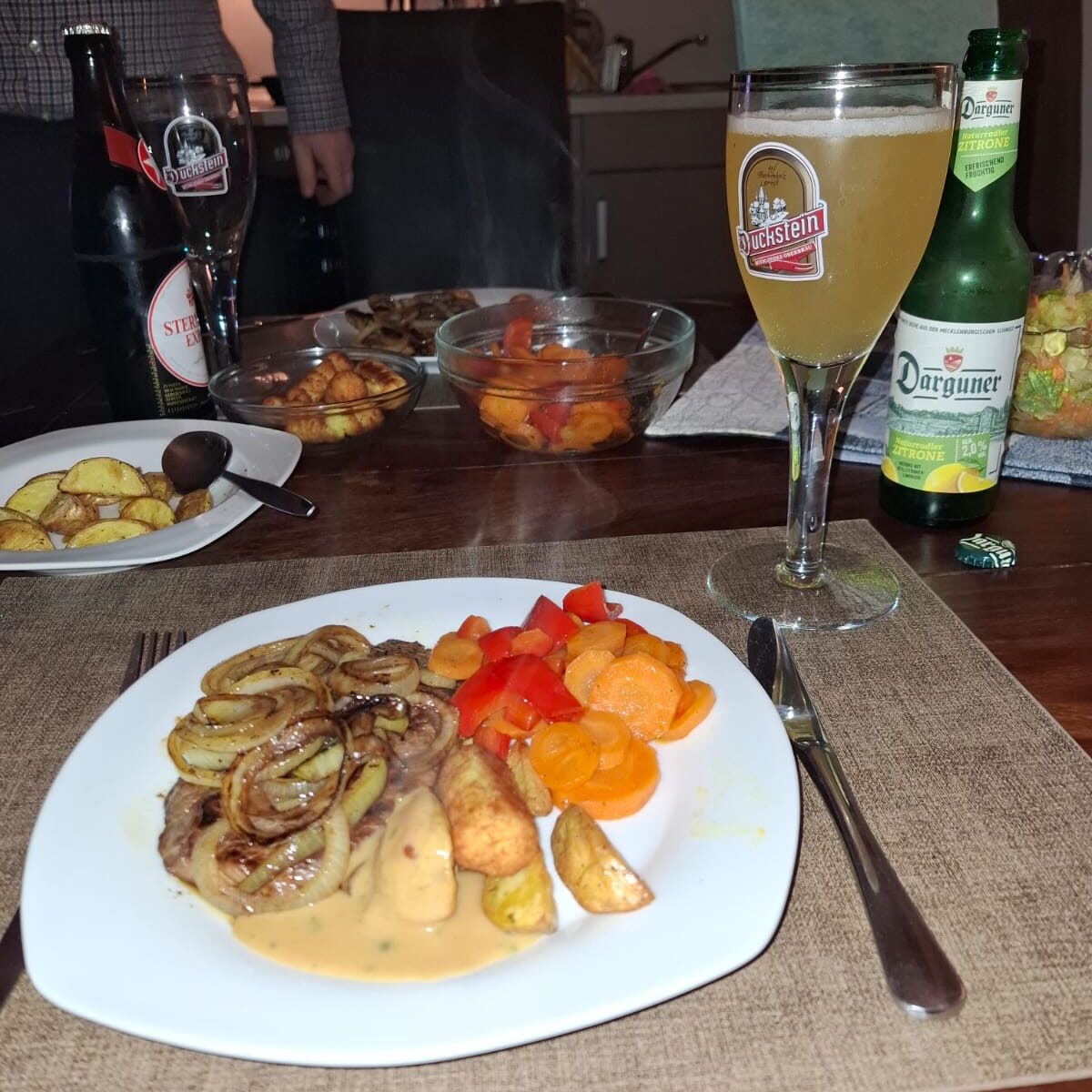 Nach einem Einkauf im örtlichen Rewe gab es ein Feuerwerk des Abendessens: Kroketten, Kartoffelspalten selbst gemacht, Pfeffersauce, Möhren-Paprika-Gemüse und ein Steak mit Zwiebeln. Nicht zu vergessen die Schale Bornholm-Salat. Lecker.