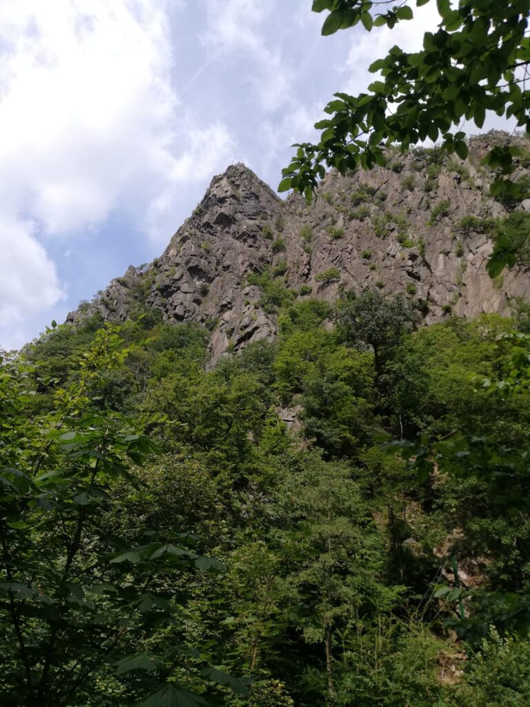 Das Bodetal, der Grand Canyon des Ostharzes, lag vor uns. Es ist eines der spektakulärsten Täler des Harzes. Bis zu 230 Meter steigen schroffe Felswände fast senkrecht auf und drücken die Bode in ein enges Flussbett. Das Bodetal zwischen Thale und Treseburg steht bereits seit 1937 unter Naturschutz. Man findet hier zahlreiche seltene Tier- und Pflanzenarten. Mit viel Glück entdeckt man auch einen Feuersalamander. Immer wieder liegen an den steilen Hängen umgestürzte Bäume, die dort verwittern. Stellenweise rutschen Gerölllawinen weit ins Tal.