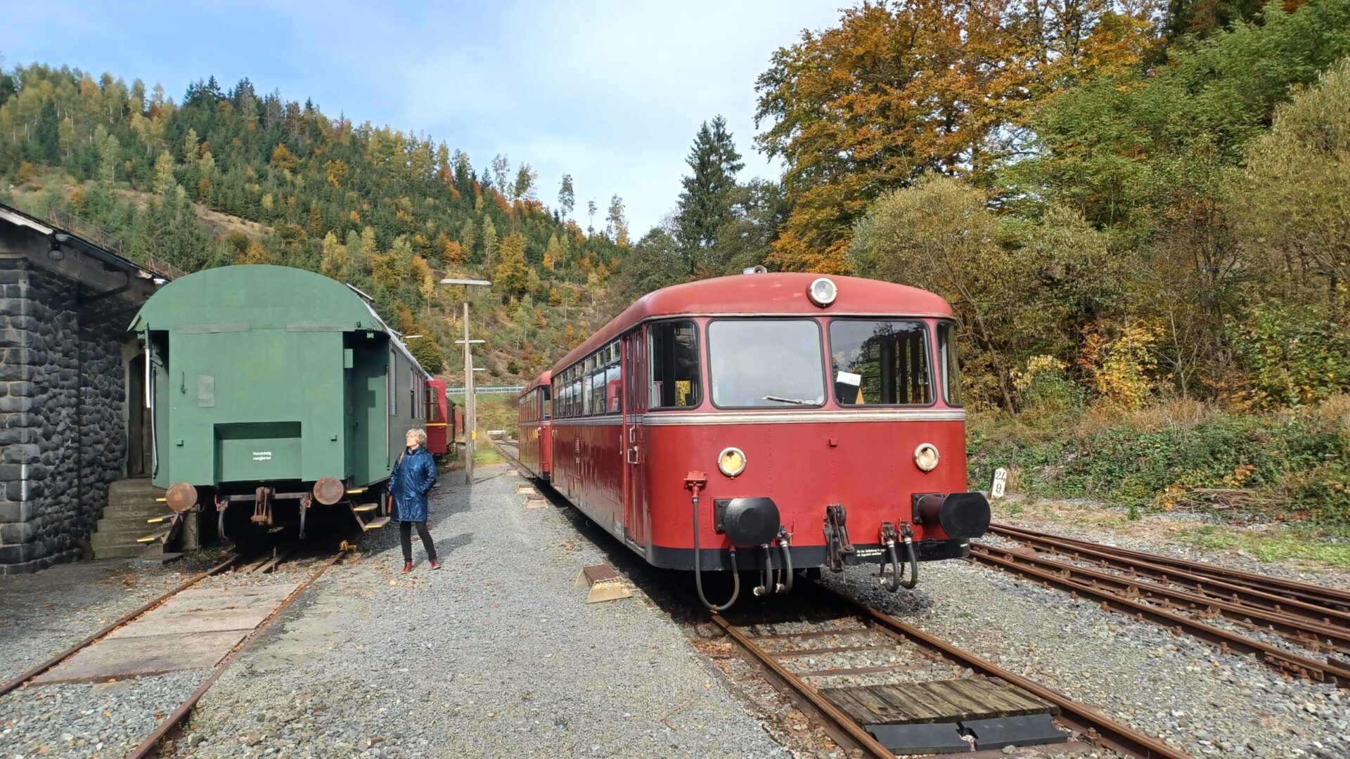 Wir setzten uns dann in den Westen ab. Genauer gesagt, fuhren wir ca. 20 km bis Nordhalben in Bayern, von wo aus wir mit dem historischen Schienenbus, dem „Roten Brummer“, eine Reise durch das herbstliche und wirklich romantische Rodachtal unternahmen. Ein ehrenamtlicher Verein ermöglicht diese Touren immer sonntags zwischen den Ortschaften Nordhalben und Steinwiesen. Man ist etwa 30 min unterwegs und quert dabei auch das Naherholungsgebiet Ködeltalsperre.