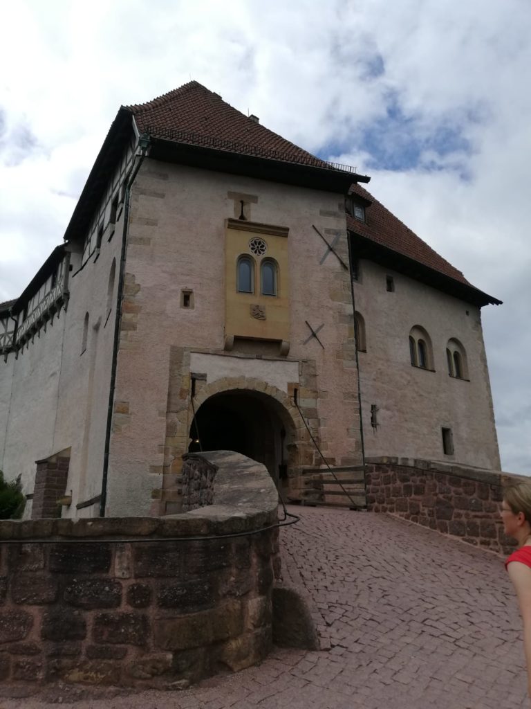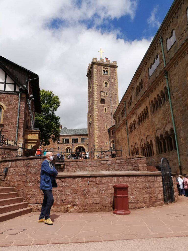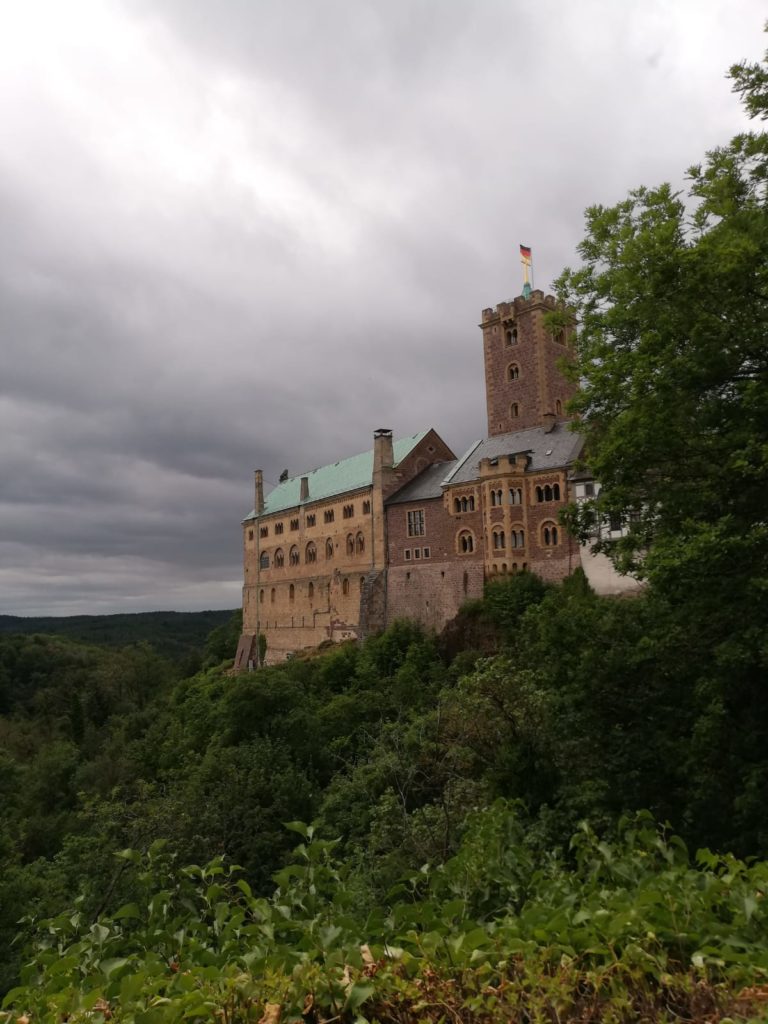 Unser nächstes Ziel war dann die Wartburg, hoch über der Stadt. Auch wenn wir schon mal vor Jahren dort waren, lohnte sich der Aufstieg wegen der enormen Geschichtsträchtigkeit (wir erinnern an Luther, der hier die Bibel übersetzte, oder an Goethe, der sehr fasziniert war). Die Aussicht über Eisenach, Hainich und Thüringer Wald ist ebenfalls sehr schön.