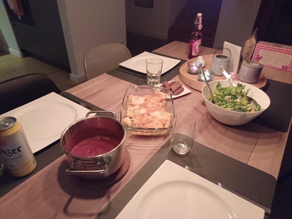 Nach dem Saunabesuch servierte „der Spitzenkoch“ das mitgebrachte Kartoffelgratin. Dazu gab es vegetarische Bratwürstchen mit Currysauce. Köstlich! Wegen des vorherigen Wasserverlustes tranken wir erneut ein Sturzbier.