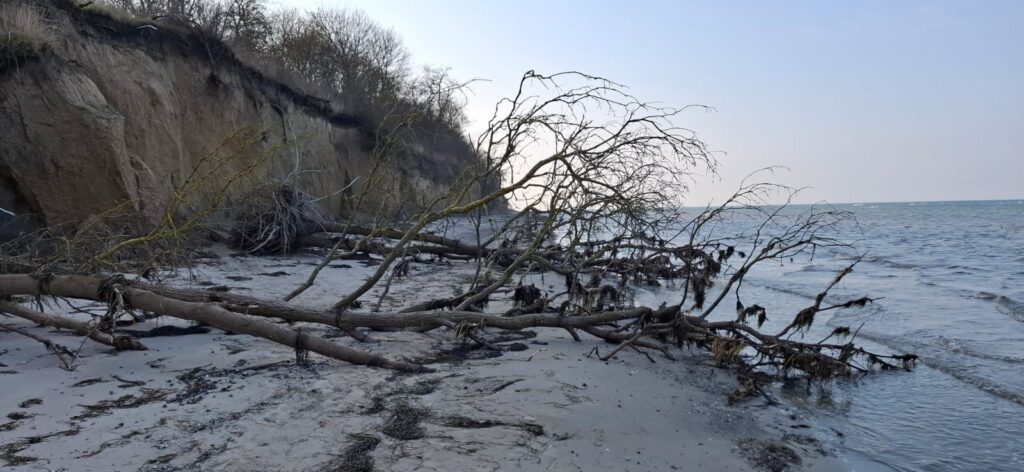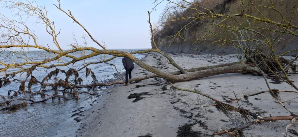 Nach einem ausgiebigen Frühstück machten wir uns zunächst auf den Weg zum Strand. Es wehte zwar ein kräftiger, vor allem eisiger Nordwind, doch wir entschieden uns für die Strecke an der Steilküste entlang. So konnte ich wenigstens meine Sammlung seltener Steine und Fossilien fortsetzen und vervollständigen. Nach knapp 10 Metern an der Wasserkante entlang glänzte der erste Donnerkeil in der Sonne.