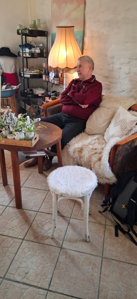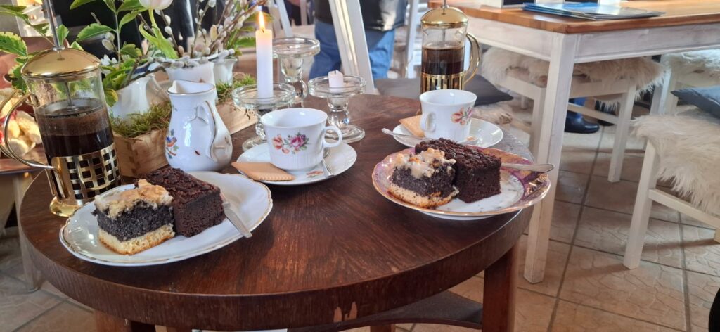 Gemäß dem Motto „Ohne Torte und Gebäck hat das Leben keinen Zweck!“ machten wir einen Ortskontrollgang (OKG) und entdeckten tatsächlich noch ein kleines, etwas rustikales Lokal, in dem es zwar keine Torte, dafür hausgemachten Kuchen gab. Das Sofa gehörte also uns.
