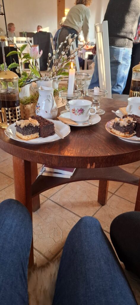 Gut 2 Stunden brauchten wir bis Gollwitz, dem heutigen Auflugsziel. Uns war das wunderschöne kleine Ladencafé eingefallen, welches wir leicht unterkühlt erreichten und in dem wir uns stärken wollten. Das war allerdings nicht nur unsere Idee und so war bereits 14.10 Uhr, ganze 10 Minuten nach der Öffnung, der Gastraum überfüllt und es warteten viele Leute auf erste freie Plätze. Das war es mit der Aussicht auf tolle Torten. Es wäre ein sinnloses Unterfangen gewesen, zu warten. Wir hatten ja Nussriegel dabei, die erstmal den Zuckerspiegel wieder etwas nach oben brachten.