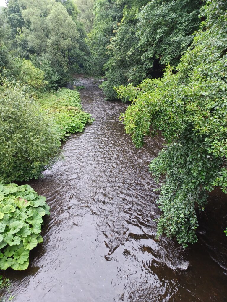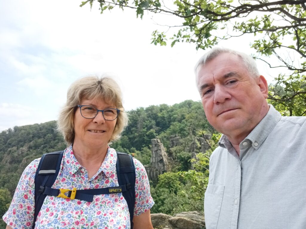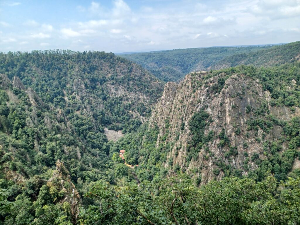 Oben angekommen, zeigte sich endlich die Sonne. Der Rundgang und auch das Erklimmen einzelner Felsen begann. Naja, nicht jedermann ist so waghalsig, auch ungesicherte Vorsprünge zu besteigen. Steile Hänge, stellenweise bis ins Tal gerutschte Gerölllawinen, abgestürzte Bäume, soweit das Auge reicht. Auch der Blick zur Roßtrappe idyllisch. Stellt sich die Frage, warum der Riese Bodo bei seinem Sprung dahin abstürzte. Aber so kam wenigstens der Fluss zu seinem Namen.