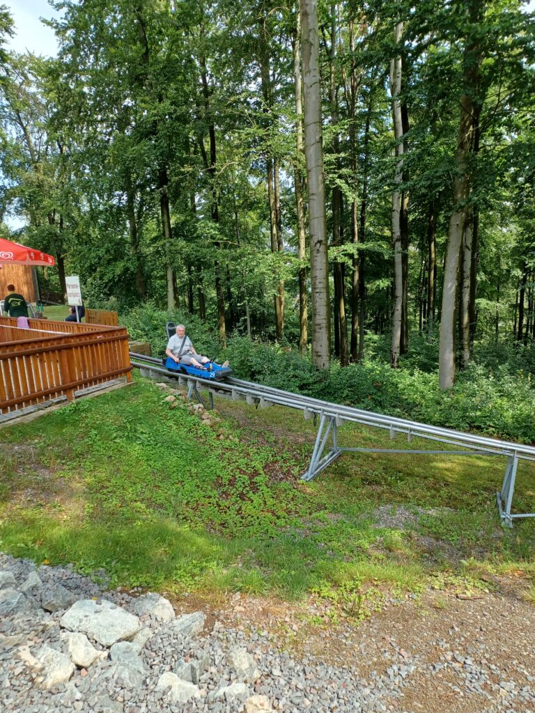 Nach einem zünftigen Kesselgulasch bzw. einer Erbsensuppe unter Beobachtung einer Hexe gesellten wir uns noch in den Trubel der Attraktionen, die unbedingt auch an diesem Ort errichtet werden mussten. Der Mensch braucht seinen Spaß, dachte auch Heiko. Und schon war er unterwegs auf der Sommerrodelbahn.