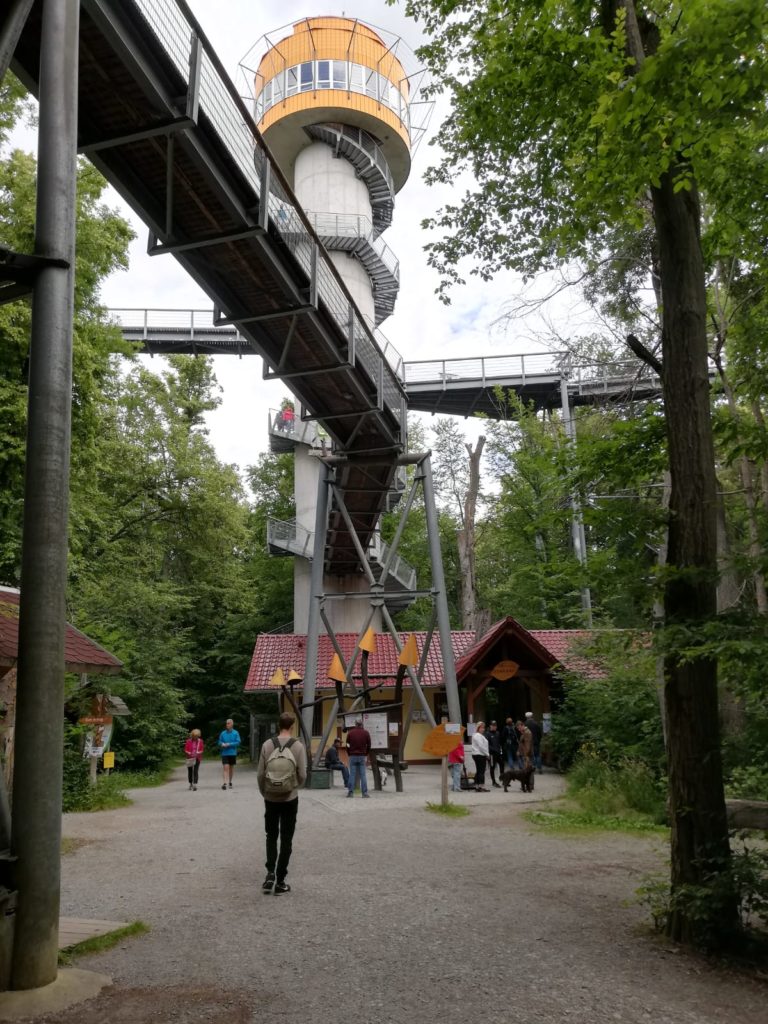 Dafür ging es natürlich in den Hainich-Nationalpark. Hier befindet sich neben vielen verschiedenen, gut ausgeschilderten Wanderwegen, auch ein Baumkronenpfad. Die Plattformen des Rundwegs über den Bäumen sind dabei bis zu 25m, ein Aussichtsturm mit Weitblick über Nationalpark und Umland sogar über 40m hoch. Besonders am Nationalpark Hainich ist, dass sich hier noch viele Buchen finden, da der Wald im Laufe der Zeit zwar immer noch stark, aber doch nicht tiefgreifend durch den Menschen verändert wurde. So kann man neben den Bäumen, von denen Wörter wie „Buch“ oder „Buchstabe“ abstammen, auch Ahornbäume und Linden von oben betrachten und vor allem einmal die Blätter der Baumkrone berühren. Der heute teils böige Wind tat sein übriges und die Bäume schwankten teilweise ganz schön stark…