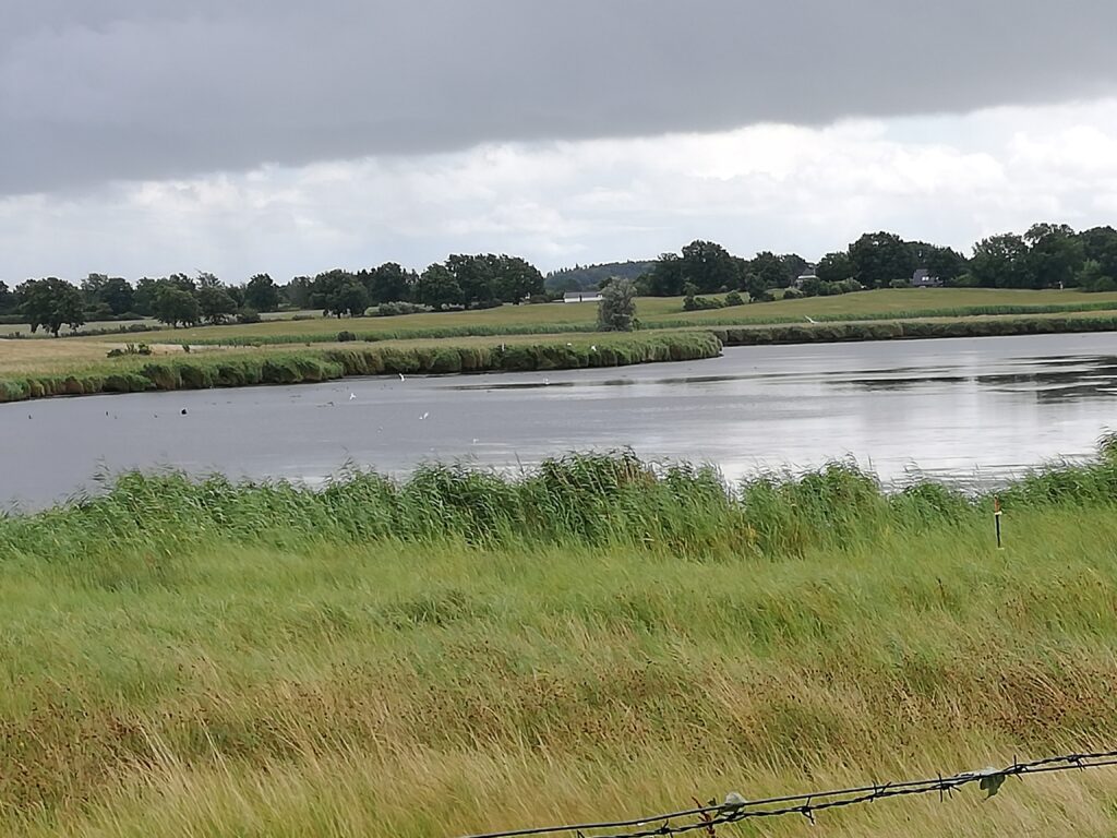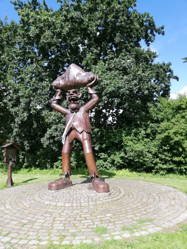 Unterwegs fiel uns eine Skulptur des „Riesen von Ulsnis“ am Straßenrand auf. Die vorhistorische Zeit der hiesigen Gegend hält einige Sagen bereit, so auch die des Ulsnis und seines Vaters, die miteinander einen erbitterten Streit führten, obwohl oder gerade weil sie an den gegenüberliegenden Ufern der Schlei lebten. Ihre Wut war so riesig, dass sie sich gegenseitig mit Steinen bewarfen und dabei ihre Kirchtürme zerstörten. Der Alte wurde dabei sogar getötet. Und wie es in Sagen üblich ist, bekamen die Orte die Namen nach den Riesen Ulsnis und Rieseby.
