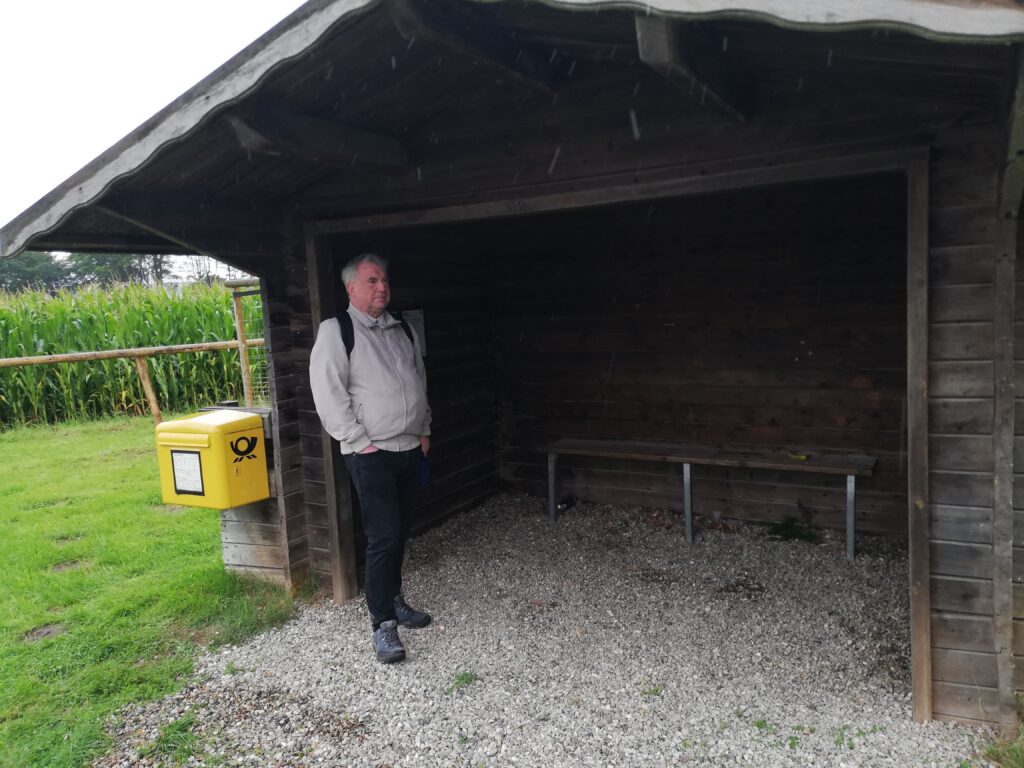 Nach dem Verlassen des herrlichen Waldes mussten wir an kleineren Straßen entlang. Darüber waren wir ausnahmsweise mal richtig glücklich, denn schlagartig hatten wir „Aprilwetter“. Eine Wolkenfront mit teilweise sehr starkem Regen löste die nächste ab. Also peilten wir die Bushaltestellen an, um wenigstens ein Dach über dem Kopf zu haben. Danach war stets wieder eitel Sonnenschein und wir hatten Blick auf die Schönheit dieser Gegend.