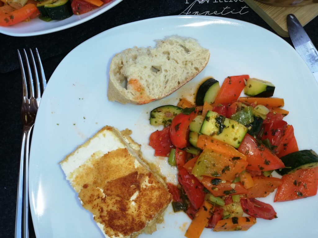 Kaffee gab es nach der Tour am Parkplatz. Zum Abendessen blieb es heute vegetarisch. Zur Gemüsepfanne hatten wir überbackenen Schafskäse.